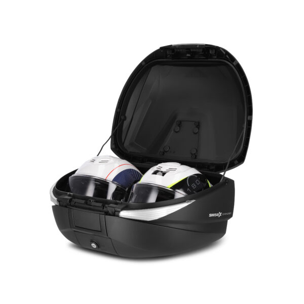 Vrchní kufr SH58X s karbonovou úpravou a s nastavitelným objemem ve 3 různých polohách (46, 52 a 58 litrů), má kapacitu pro uložení 2 XXL helem bez nutnosti položit je na bok, plus cestovní doplňky.